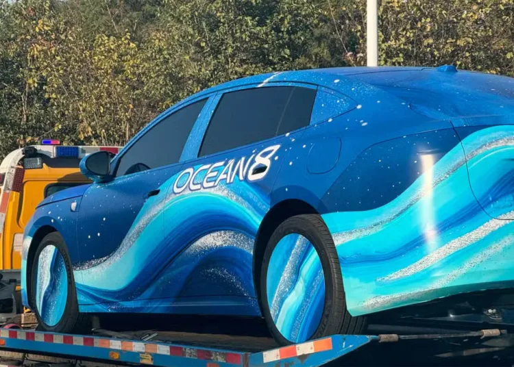Zdjęcia, które obiegły chińską platformę społecznościową Xiaohongshu, nie pozostawiają wątpliwości co do tożsamości pojazdu. Mimo szczelnego oklejenia folią z motywem fal, na boku auta wyraźnie widać napis „OCEAN 8”. To potwierdzenie, że mamy do czynienia z nowym, topowym przedstawicielem gamy Ocean, który ma stanąć na szczycie oferty obok zapowiadanego SUV-a Sealion 08.