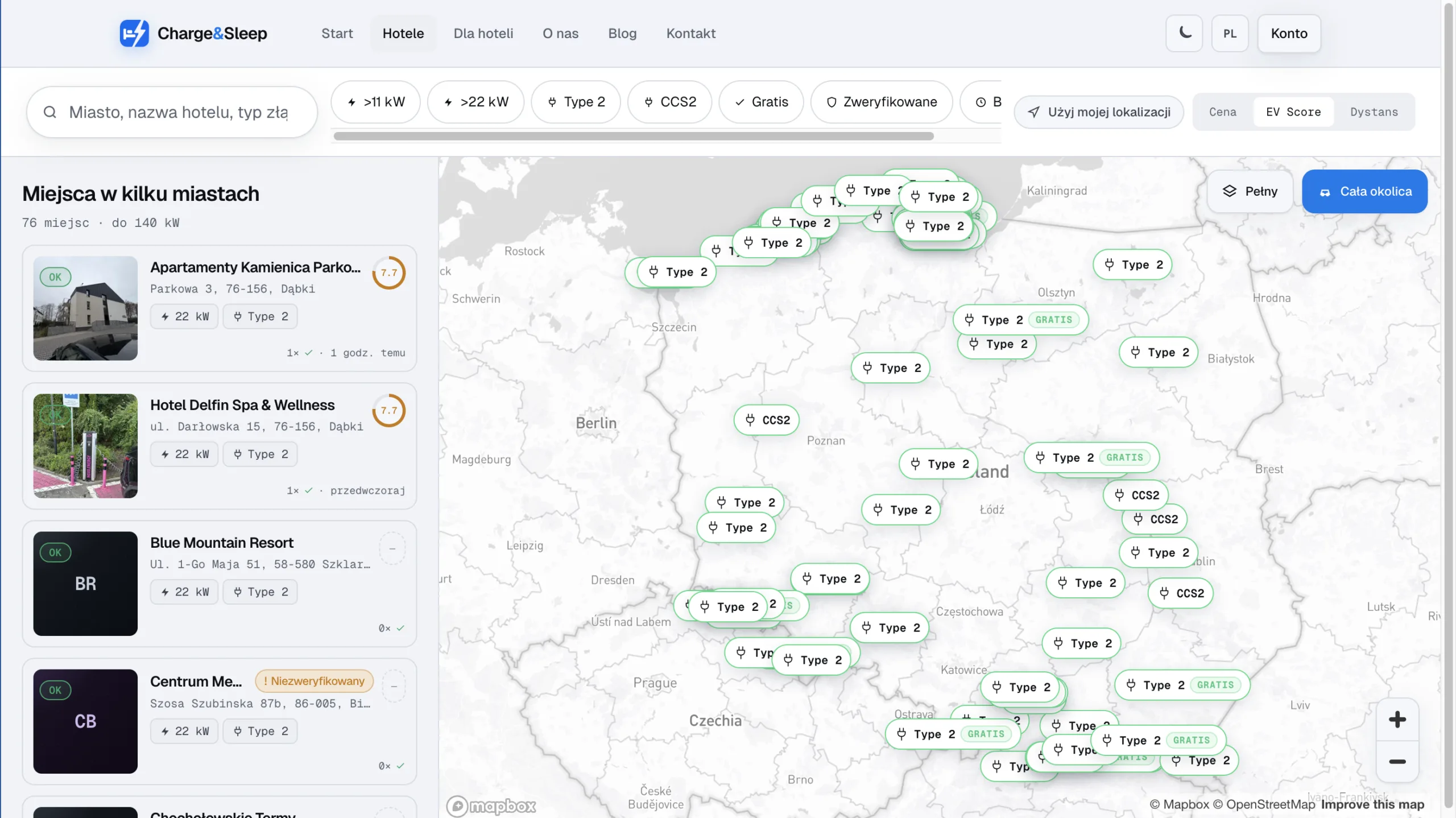 Projekt działa w wersjach PL/EN/DE, więc celuje nie tylko w lokalne użycie. To ma sens przy podróżach transgranicznych, gdzie problem z jakością informacji o hotelowym ładowaniu bywa jeszcze większy.