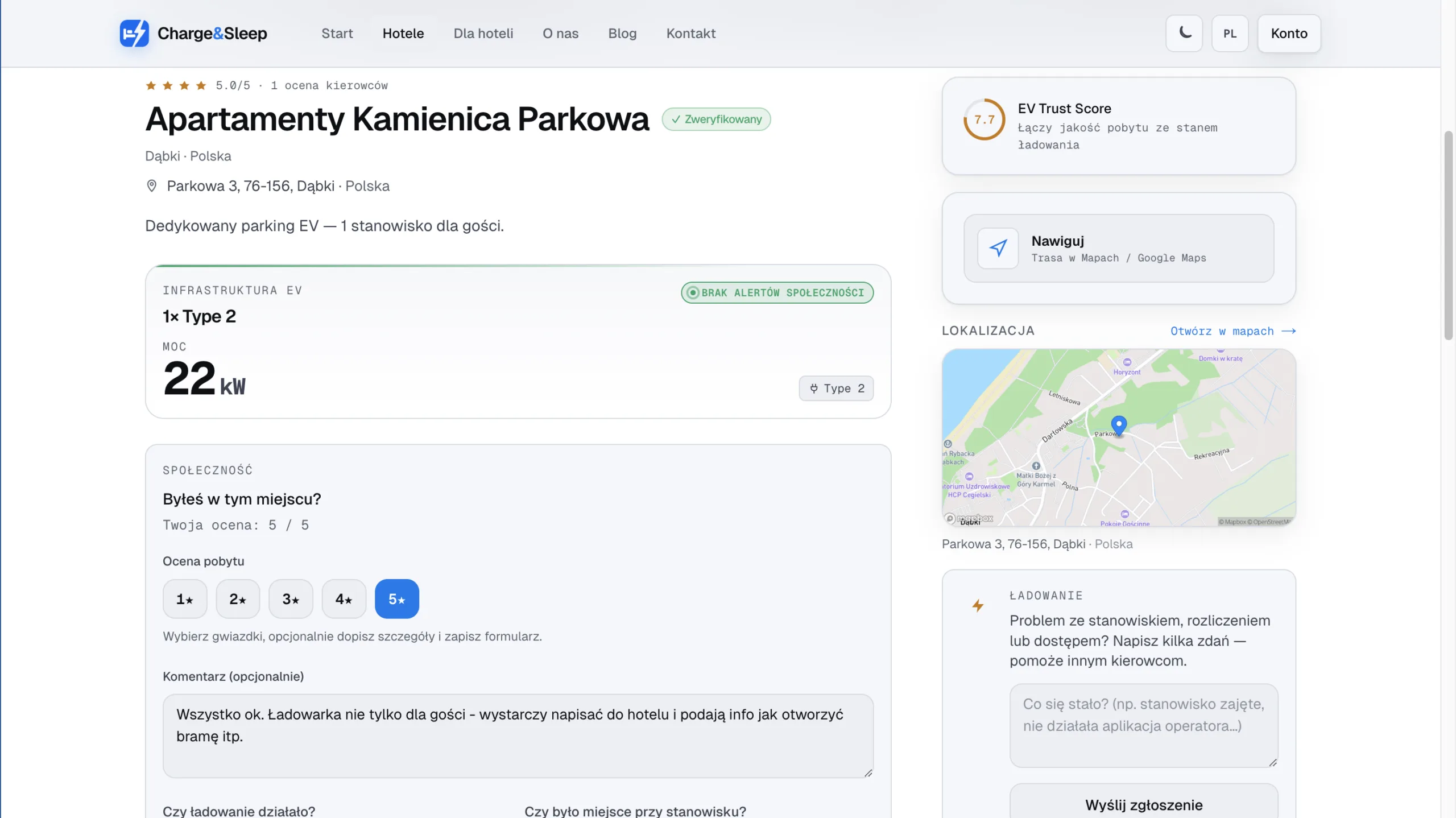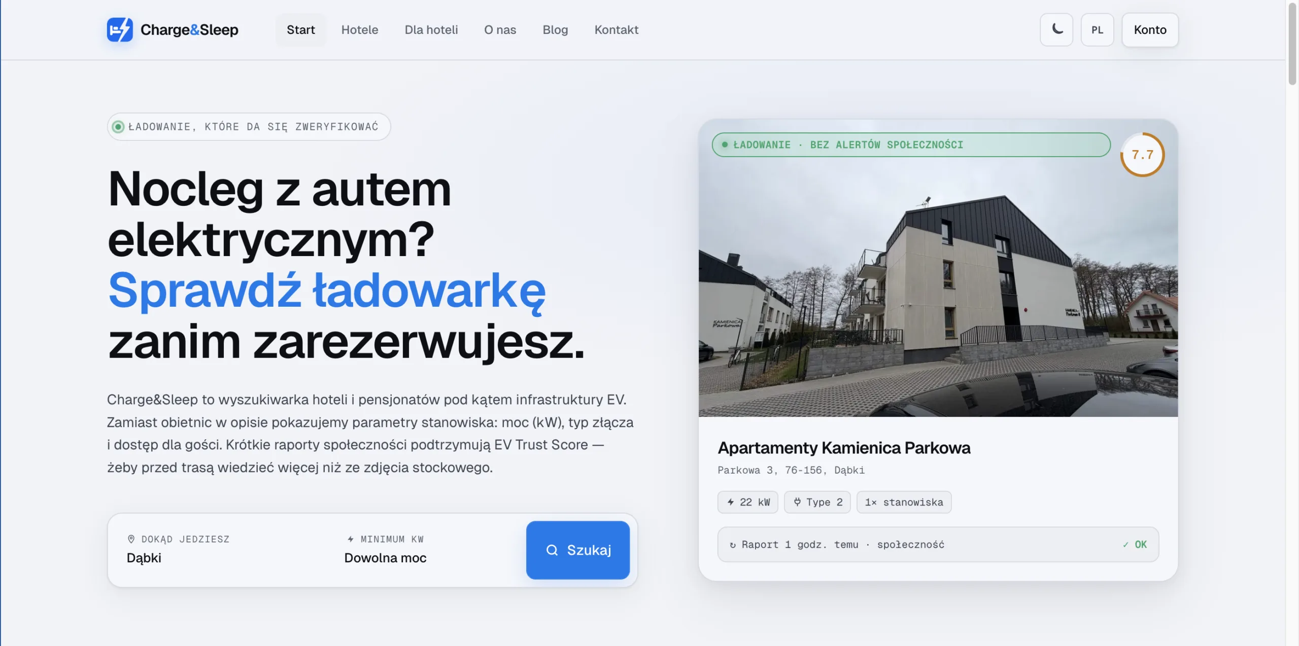 To też ciekawy ruch biznesowy, bo Charge & Sleep nie przejmuje procesu rezerwacji. Użytkownik dostaje kontekst EV, a sam nocleg może kupić tam, gdzie chce. Taki model jest prostszy i czytelny: serwis ma pomóc ocenić ładowanie, a nie sprzedawać pokój.