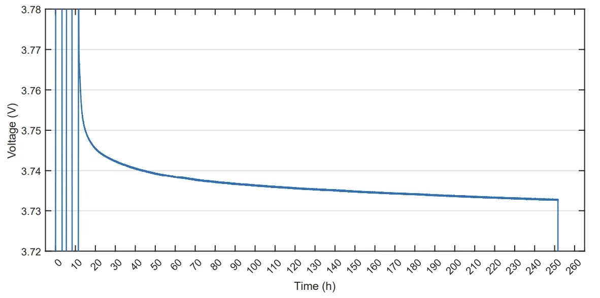 Później było znacznie spokojniej. Między 10. a 240. godziną napięcie spadło już tylko o 12 mV, z 3745 mV do 3733 mV. To sugeruje, że po początkowej stabilizacji ogniwo zachowywało się dość spokojnie.