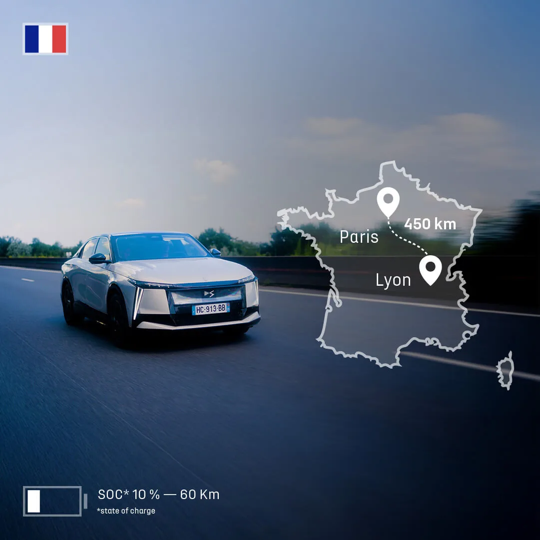 • Trasa z Paryża do Lyonu we Francji (450 km) zakończyła się z 10% zapasu energii w baterii, co przekładało się na dodatkowe 60 km zasięgu.