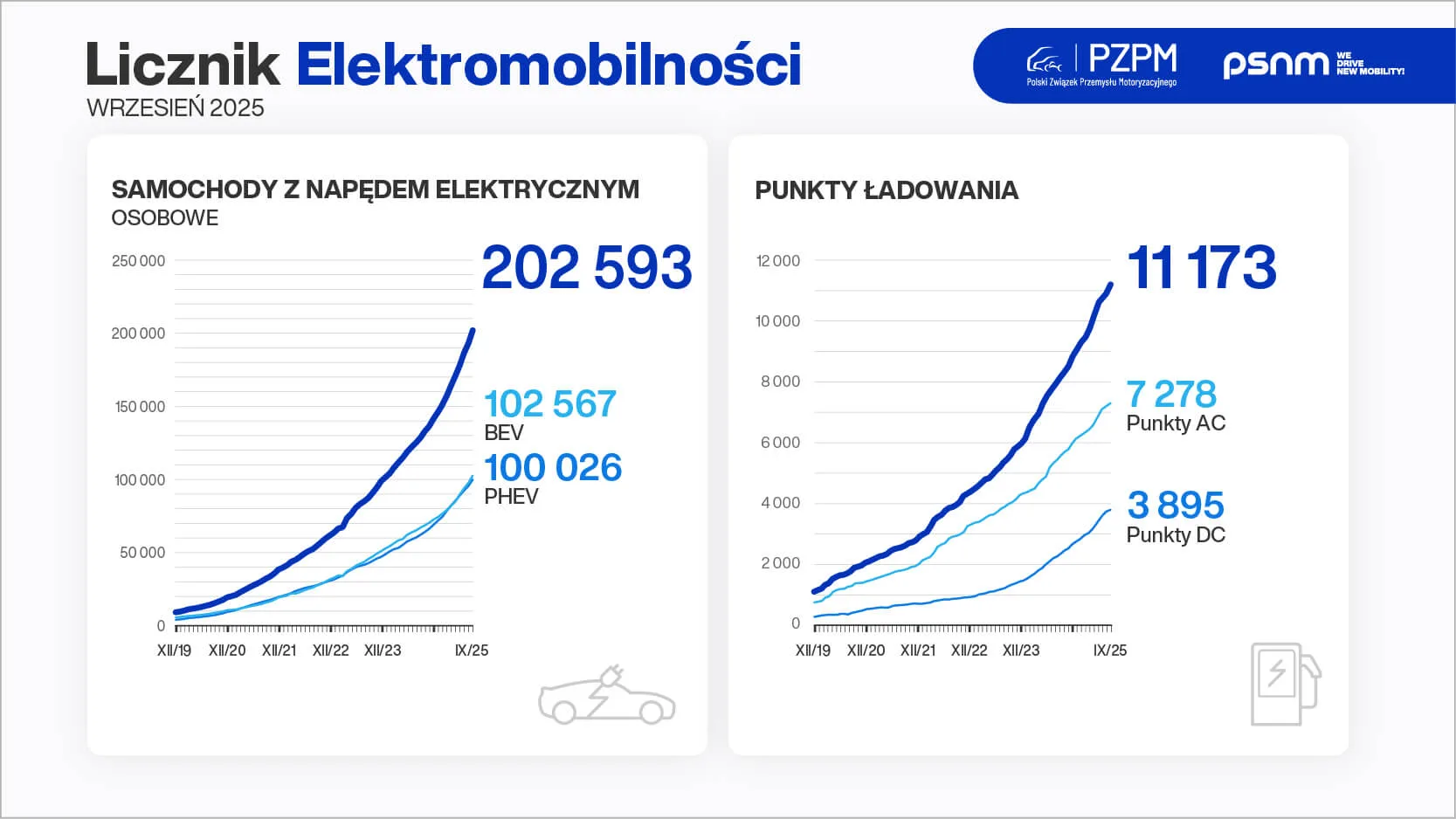 Dane za trzeci kwartał 2025 roku są imponujące. Po polskich drogach jeżdżą już 202 593 samochody osobowe z napędem elektrycznym. Co ważne, niemal idealnie po połowie dzielą się na 102 567 aut w pełni elektrycznych (BEV) oraz 100 026 hybryd plug-in (PHEV). Oznacza to, że w obu tych kategoriach przekroczyliśmy psychologiczną granicę 100 tysięcy sztuk.