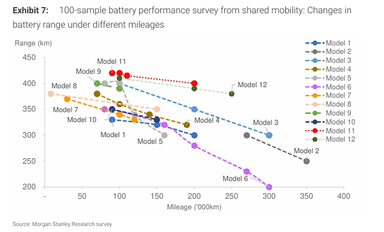 Analitycy Morgan Stanley przyjrzeli się danym pochodzącym z rzeczywistej eksploatacji 12 modeli samochodów elektrycznych w czterech dużych chińskich miastach. Badanie objęło próbkę 100 pakietów bateryjnych. Celem było sprawdzenie, jak ogniwa zachowują się po ekstremalnym przebiegu rzędu 2 milionów kilometrów (1,25 mln mil).