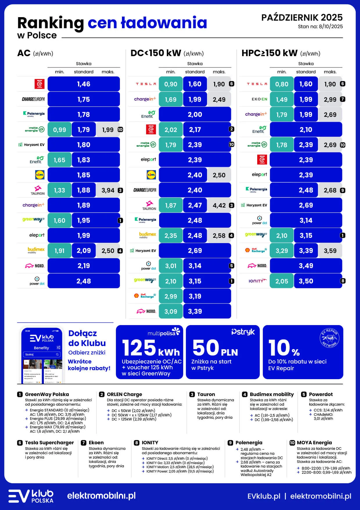 Październikowe dane bezlitośnie obnażają polaryzację rynku. Jak zauważa Łukasz Lewandowski, CEO EV Klub Polska, z jednej strony mamy Teslę, która kontroluje cały proces i może oferować niskie ceny, a z drugiej operatorów komercyjnych, którzy muszą zarobić na bardzo kosztownej infrastrukturze. Coraz częstsze stosowanie dynamicznych cen i czasowych promocji to sygnał, że branża uczy się zarządzać popytem. Dla kierowców to ważna lekcja: elastyczność i planowanie ładowania w tańszych godzinach może obniżyć koszty podróży o 40-50%.