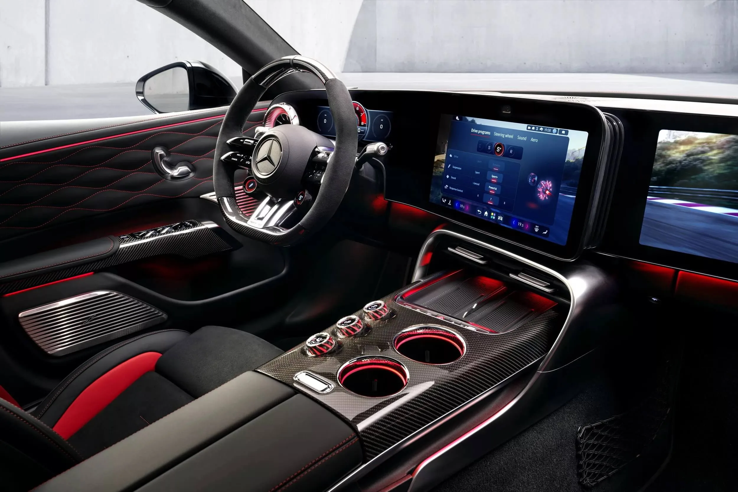 Ciekawy jest też detal ze strony kierowcy: dwa przyciski na kierownicy z własnymi wyświetlaczami LCD. AMG od lat robi takie rozwiązania w swoich modelach, ale w EV to może być jeszcze bardziej praktyczne, bo pozwala przeskakiwać między ustawieniami bez wchodzenia w menu.