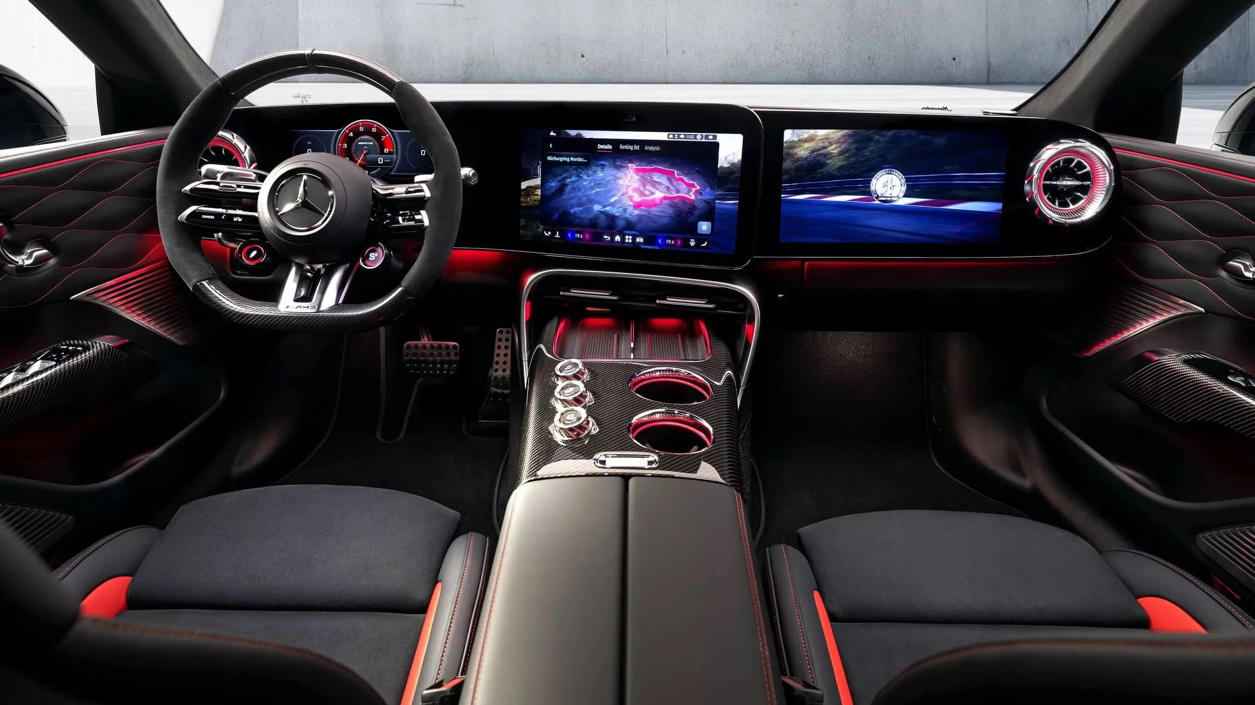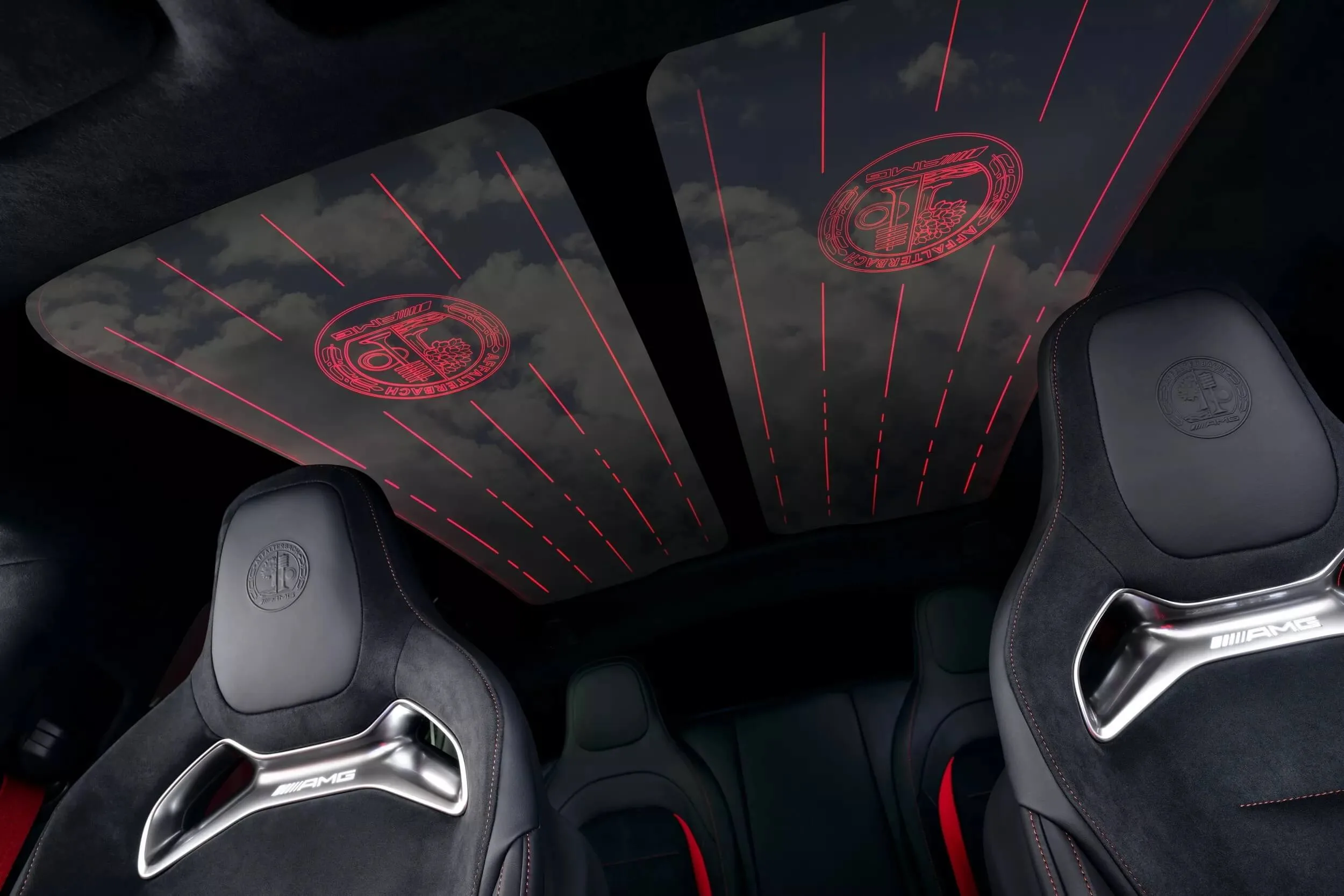 Jednym z najbardziej widowiskowych elementów jest panoramiczny dach Sky Control, który może przełączać się między trybem przezroczystym i nieprzezroczystym. W nocy potrafi też wyświetlać na szkle emblematy AMG lub pasy „racingowe”, zsynchronizowane z oświetleniem ambientowym.