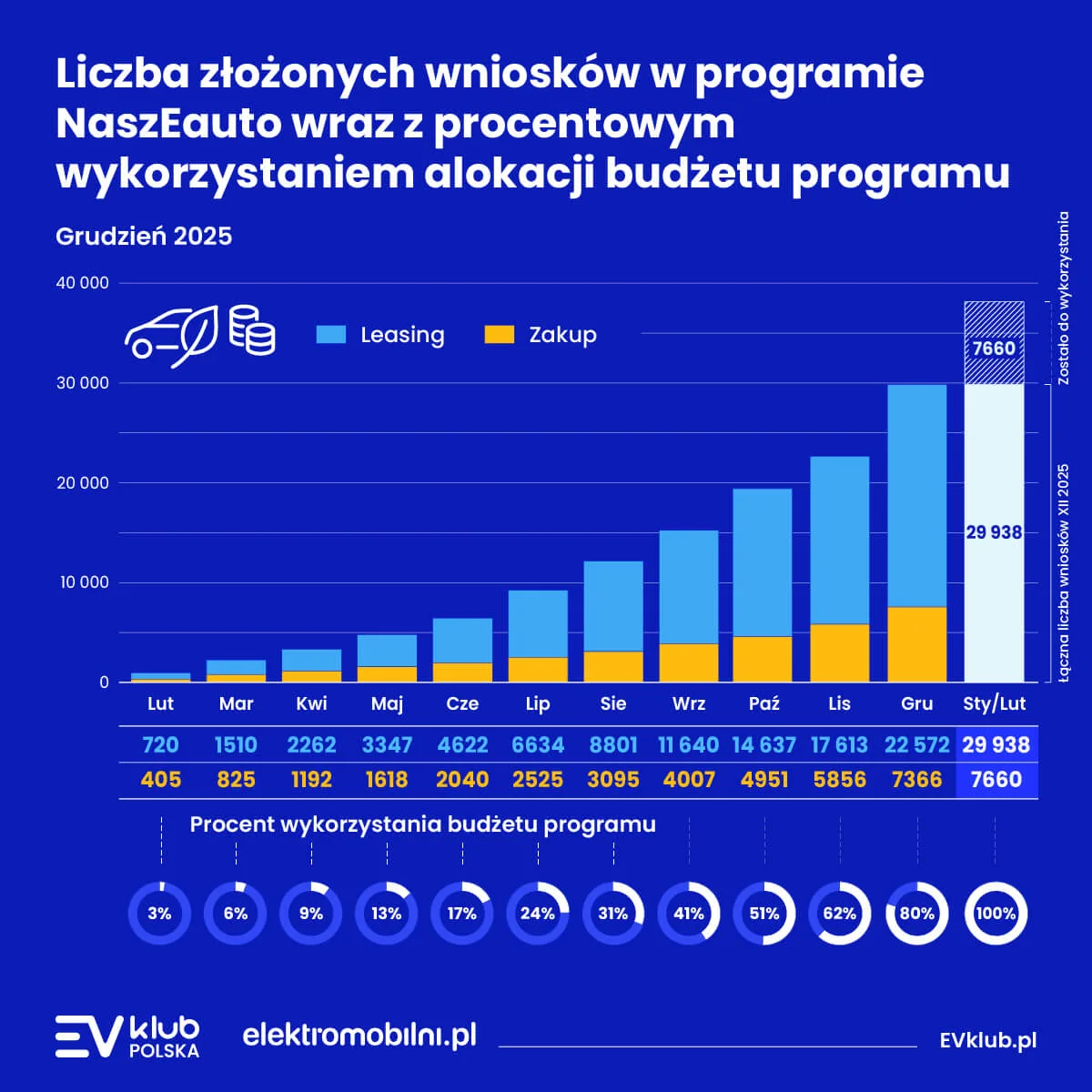 Statystyki programu „NaszEauto” potwierdzają, że polska elektromobilność opiera się na firmach. Do końca grudnia złożono łącznie blisko 30 tysięcy wniosków. Aż 75 proc. z nich dotyczyło leasingu, podczas gdy klienci indywidualni stanowili zaledwie jedną czwartą beneficjentów.