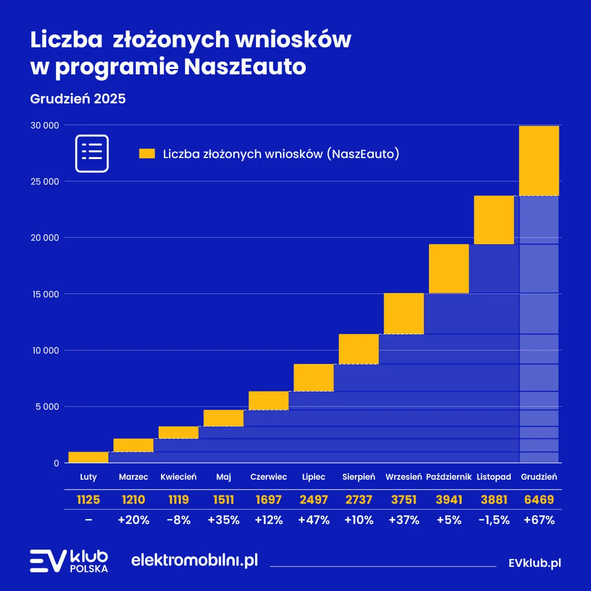 Dla zobrazowania skali tego zjawiska warto spojrzeć na początki programu. W pierwszych miesiącach funkcjonowania „NaszEauto” (luty-kwiecień 2025) urzędnicy przyjmowali średnio 1150 aplikacji miesięcznie. Grudniowy wynik przebił tę średnią ponad pięciokrotnie.