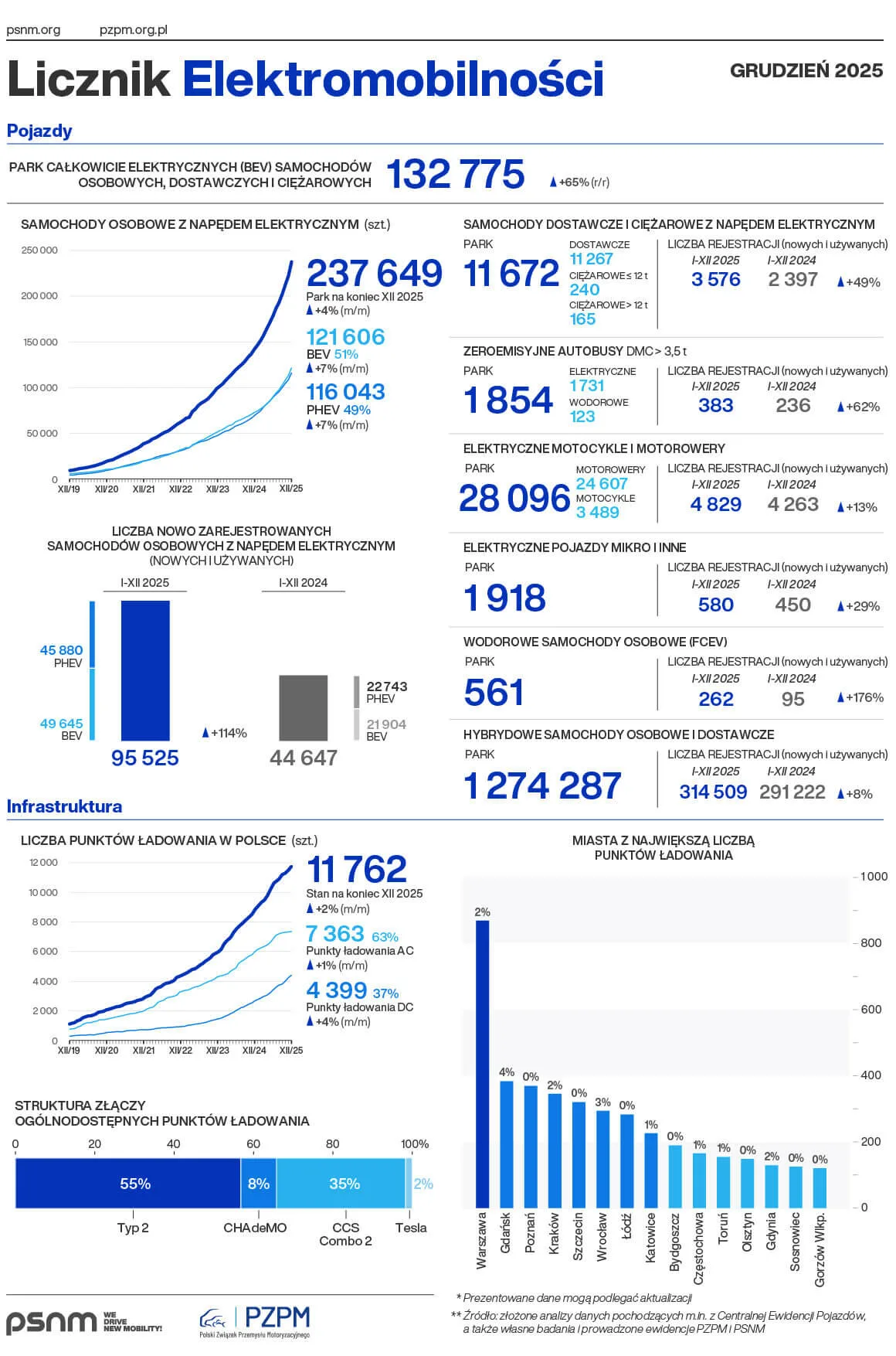 Dane są jednoznaczne. Na koniec grudnia 2025 roku w Polsce zarejestrowanych było łącznie 132 775 całkowicie elektrycznych samochodów (osobowych i użytkowych). To wynik, który jeszcze kilka lat temu wydawał się abstrakcją. Co ważniejsze, w samym tylko 2025 roku przybyło prawie 53 tysiące takich pojazdów. Oznacza to wzrost o 118 proc. względem roku 2024.