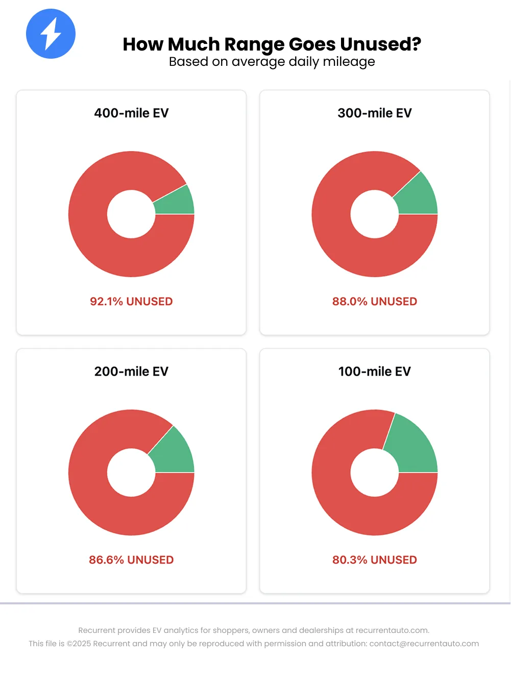 Właściciele aut z potężnymi bateriami (oferującymi ponad 550 km zasięgu) na co dzień wożą ze sobą ponad 88 procent „martwej”, niewykorzystanej energii. To psychologiczny koc bezpieczeństwa, za który słono płacimy przy zakupie auta. Paradoksalnie, właściciele aut z mniejszymi bateriami (zasięgi rzędu 250-300 km) jeżdżą swoimi autami intensywniej i efektywniej wykorzystują dostępną energię, zużywając dziennie około 20 procent zasobów akumulatora.