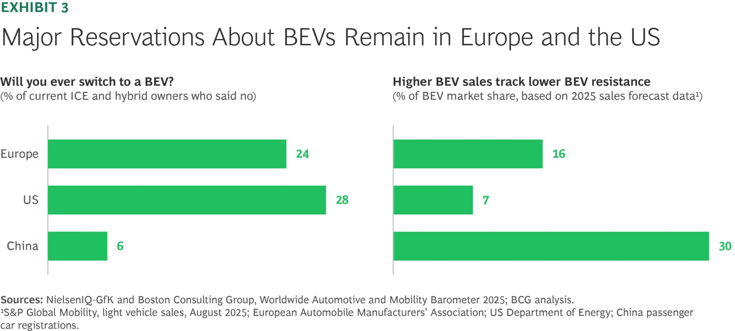 Na pierwszy rzut oka dane BCG wyglądają dla branży EV mrocznie. Z badania wynika, że aż 28% amerykanów, którzy obecnie posiadają auto spalinowe lub hybrydę, należy do grupy „never BEVers” – deklarują, że nigdy nie przesiądą się na auto w pełni elektryczne. W Europie ten odsetek jest niewiele mniejszy i wynosi 24%.
