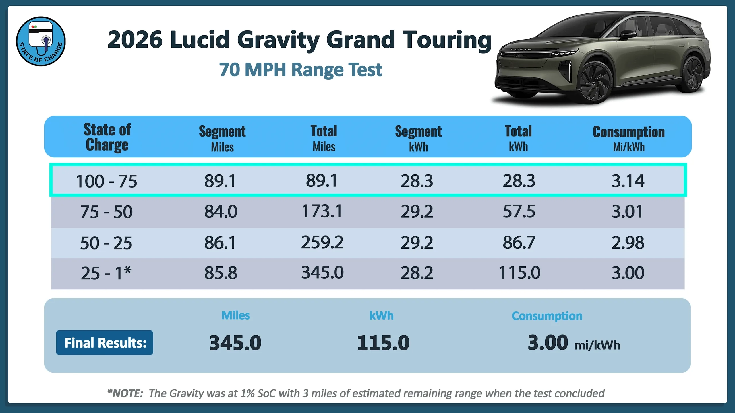 Na papierze Lucid Gravity Grand Touring to prawdziwy dominator. Luksusowy SUV z ogromną baterią o pojemności 123 kWh ma oficjalny, certyfikowany przez EPA zasięg na poziomie 450 mil, czyli około 724 km. Aby zweryfikować te dane w realnych warunkach, Tom Moloughney z kanału State of Charge przeprowadził swój standardowy test, polegający na jeździe ze stałą prędkością 70 mph (ok. 113 km/h) aż do niemal całkowitego rozładowania baterii.