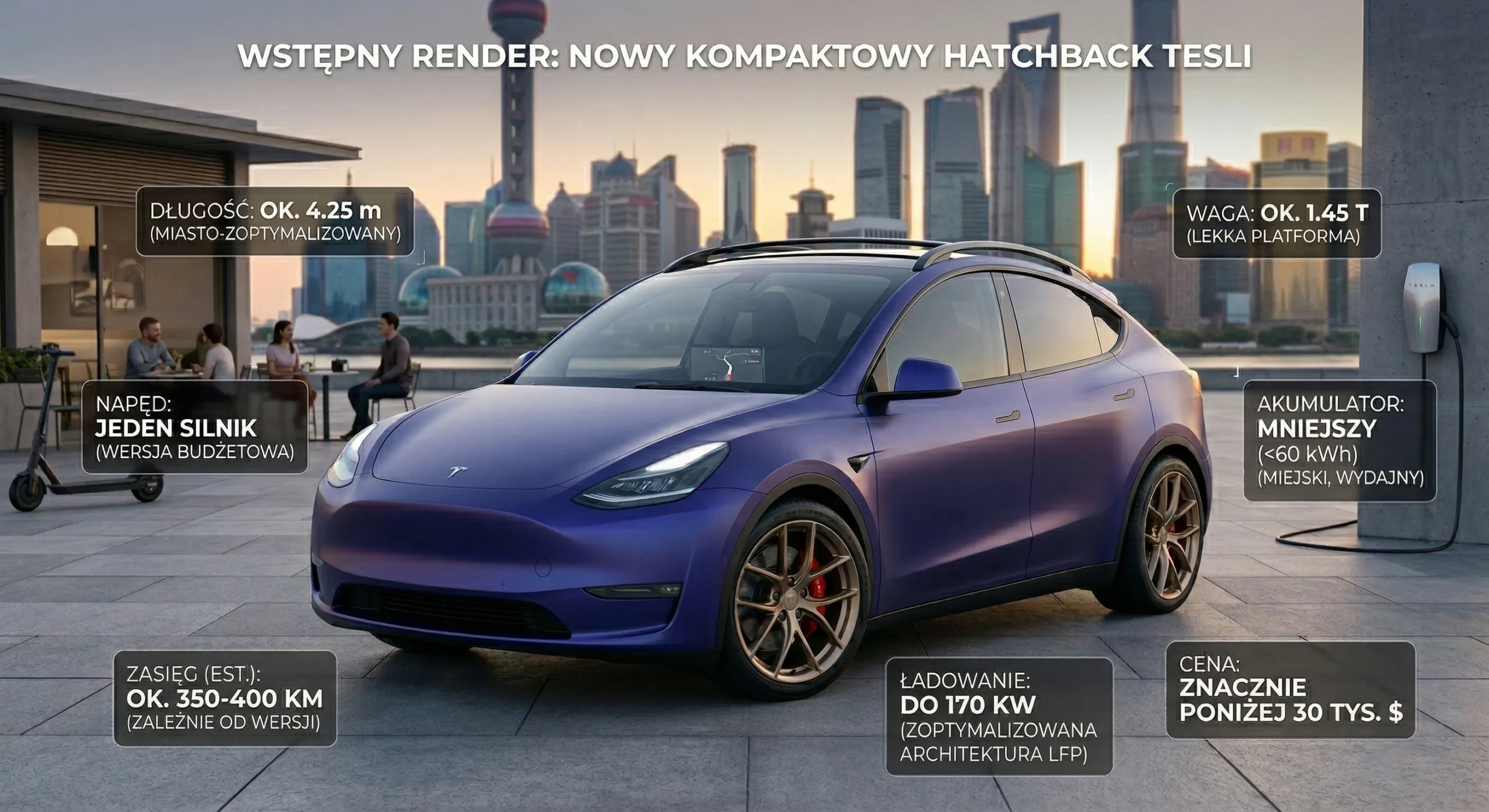 Cena ma być wyraźnie niższa niż 34 tys. dolarów, od których startuje Model 3 w Chinach. W USA punkt odniesienia to około 37 tys. dolarów za Model 3 i 40 tys. dolarów za Model Y.