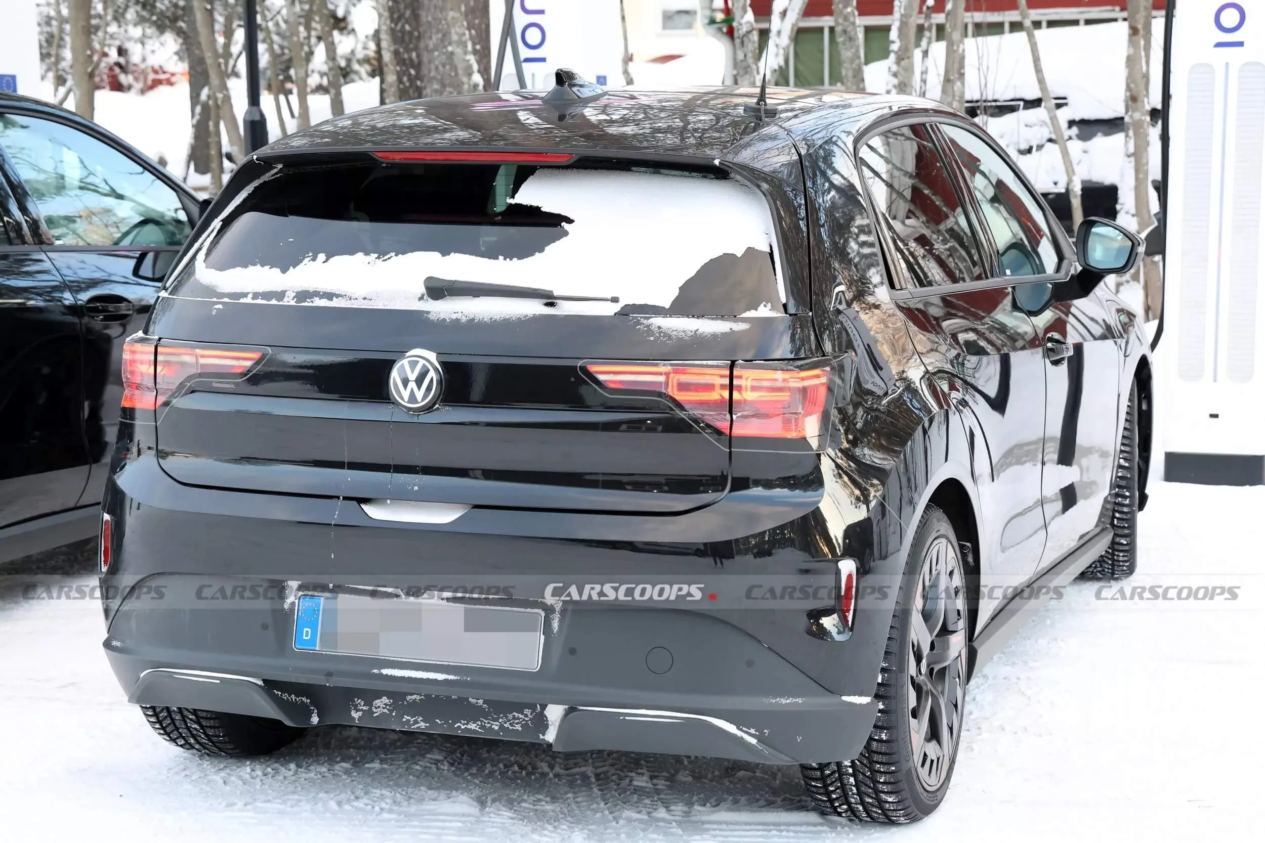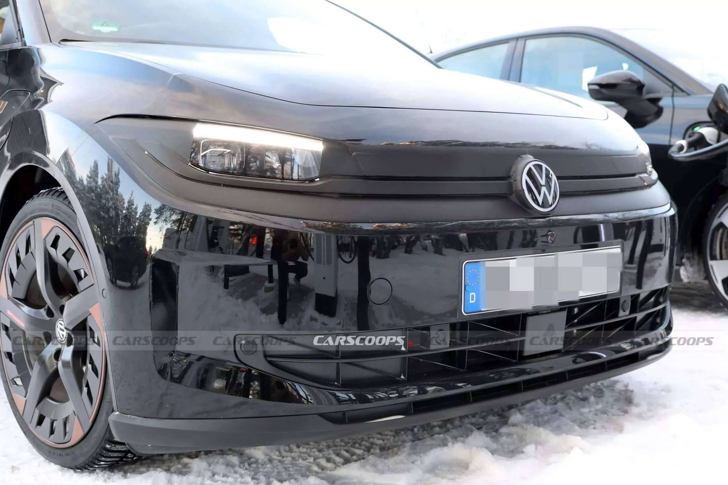 Z tyłu producent nadal maskuje pełną listwę świetlną LED, przez co lampy przypominają obecne Polo z silnikiem spalinowym. Z przodu zaklejono część grilla i reflektorów LED. Mimo tego widać już, że projekt jest dość spójny i bardziej „przyziemny” niż w wielu wcześniejszych elektrykach Volkswagena.