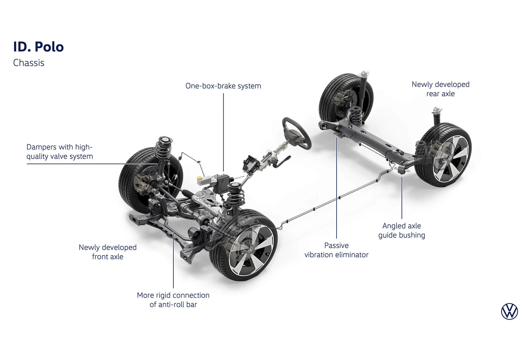 Kluczowym elementem układanki jest falownik impulsowy. Volkswagen zaprojektował go i będzie produkował we własnym zakresie. To właśnie takie decyzje, polegające na uniezależnieniu się od zewnętrznych dostawców w kluczowych podzespołach, mają umożliwić utrzymanie ceny bazowej na poziomie około 105 500 zł (przy kursie 4,22 zł za euro). Nowy układ napędowy wymusił też zaprojektowanie zawieszenia od podstaw. Z przodu znajdziemy kolumny MacPhersona, z tyłu zaś postawiono na belkę skrętną. To rozwiązanie tańsze i zajmujące mniej miejsca, co w segmencie B ma fundamentalne znaczenie dla pojemności bagażnika.