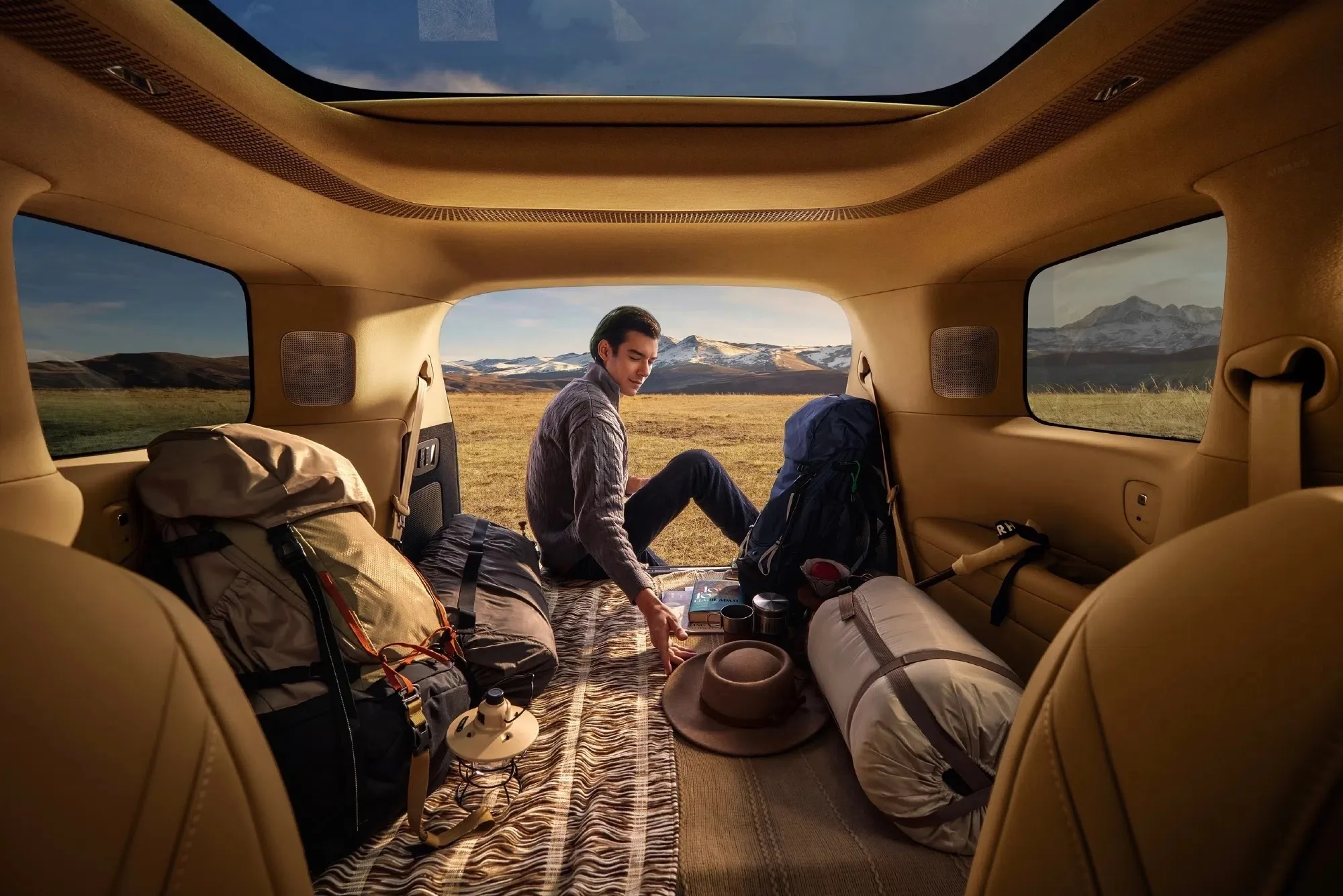 Drugi rząd ma fotele typu zero gravity, długie prowadnice przesuwu oraz elektryczne podnóżki. Trzeci rząd dostał niezależne zagłówki i możliwość złożenia na płasko, co zwiększa elastyczność bagażnika.
