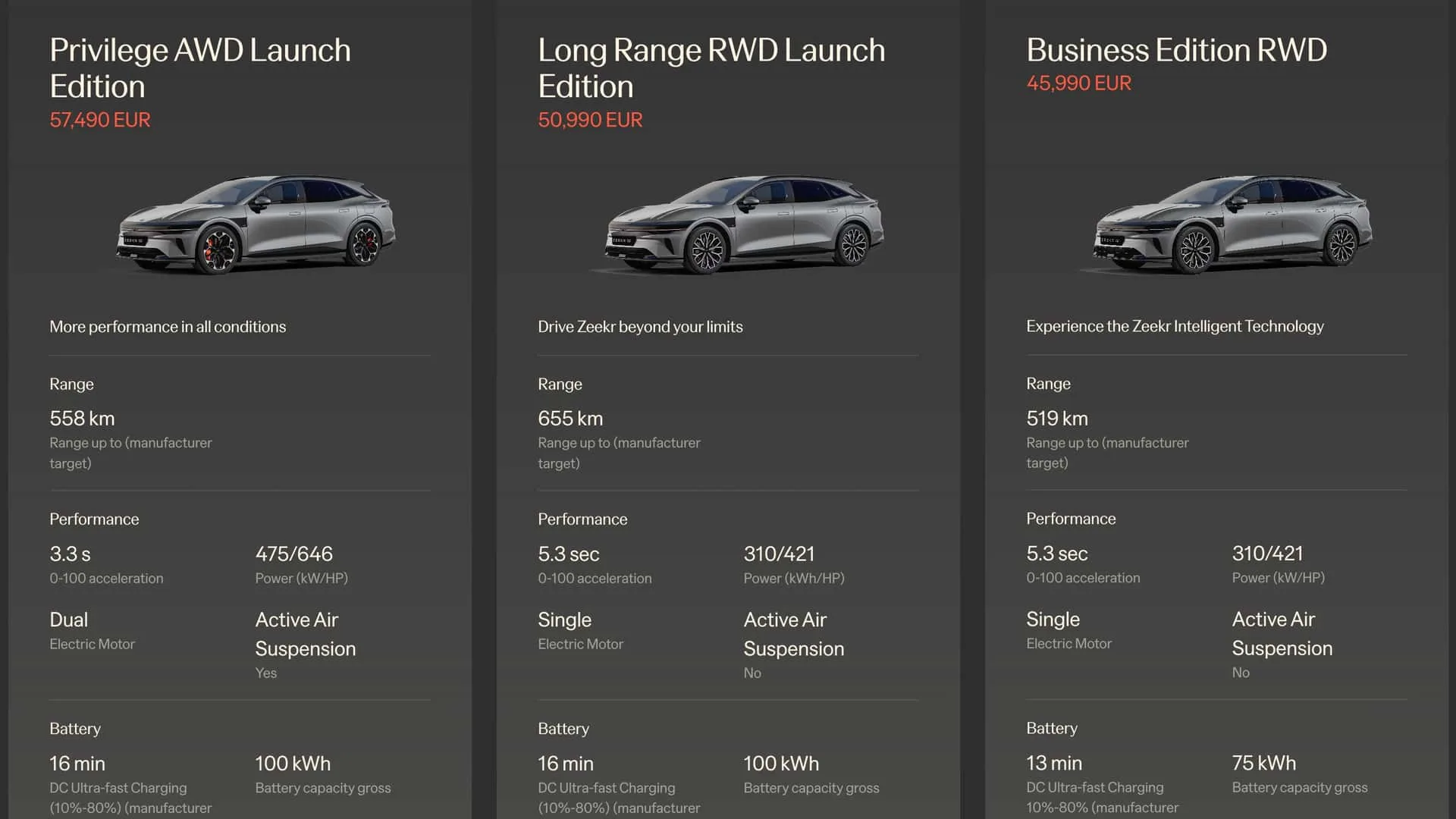 Analiza cennika pokazuje, że Zeekr nie zamierza walczyć o klienta jako „tańsza alternatywa”. Oni chcą być „lepszą alternatywą w tej samej cenie”. Ceny w Holandii ustawiono niemal lustrzanie do oferty Tesli. Wersja Long Range RWD kosztuje dokładnie tyle samo co Tesla Model Y Long Range RWD – 50 990 euro.